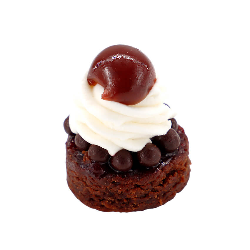 濃厚でありながらも重たすぎず、チョコレートの深いコクと、ほのかな果実の酸味とキルシュ(さくらんぼの蒸留酒)香るひと口サイズのケーキです。